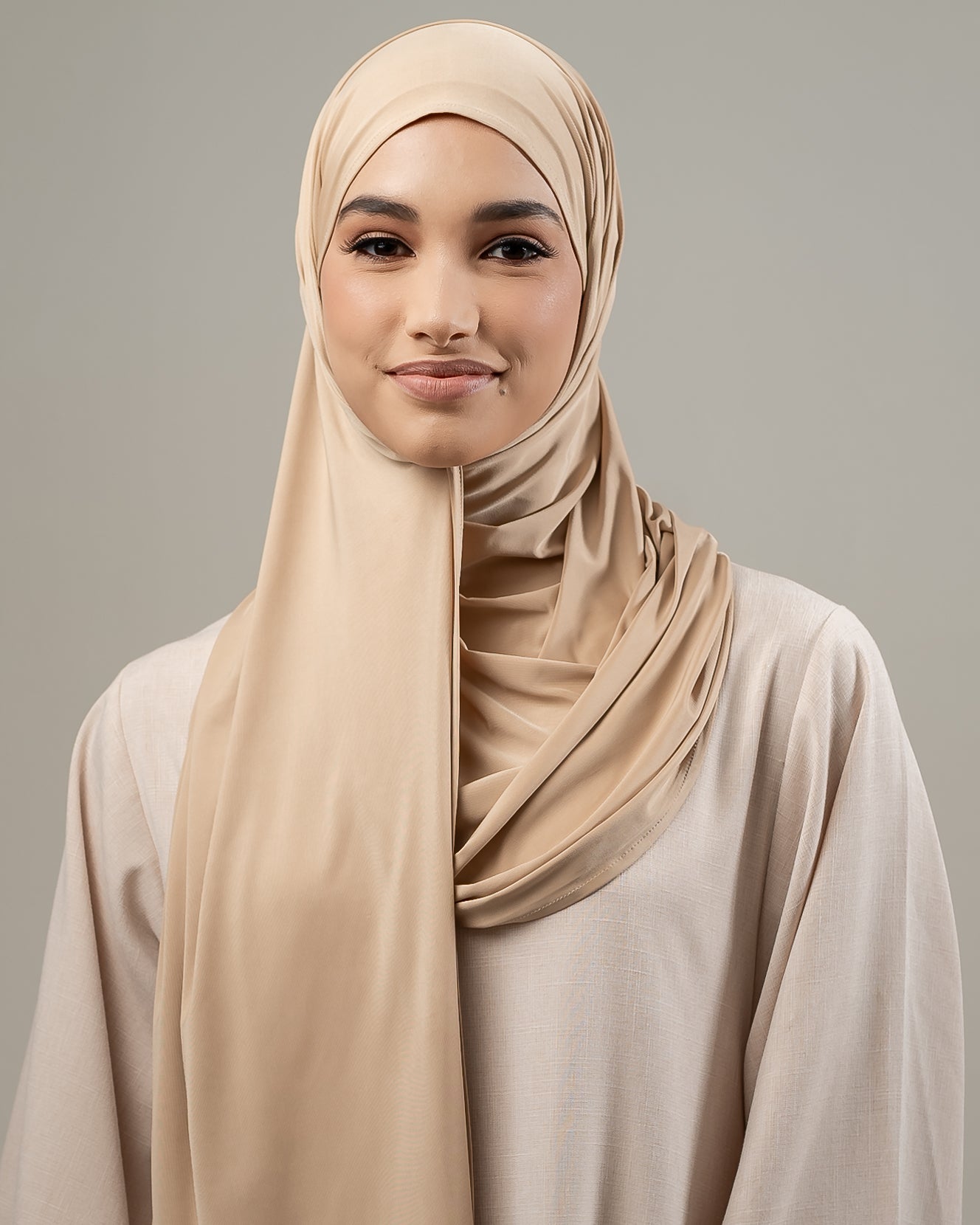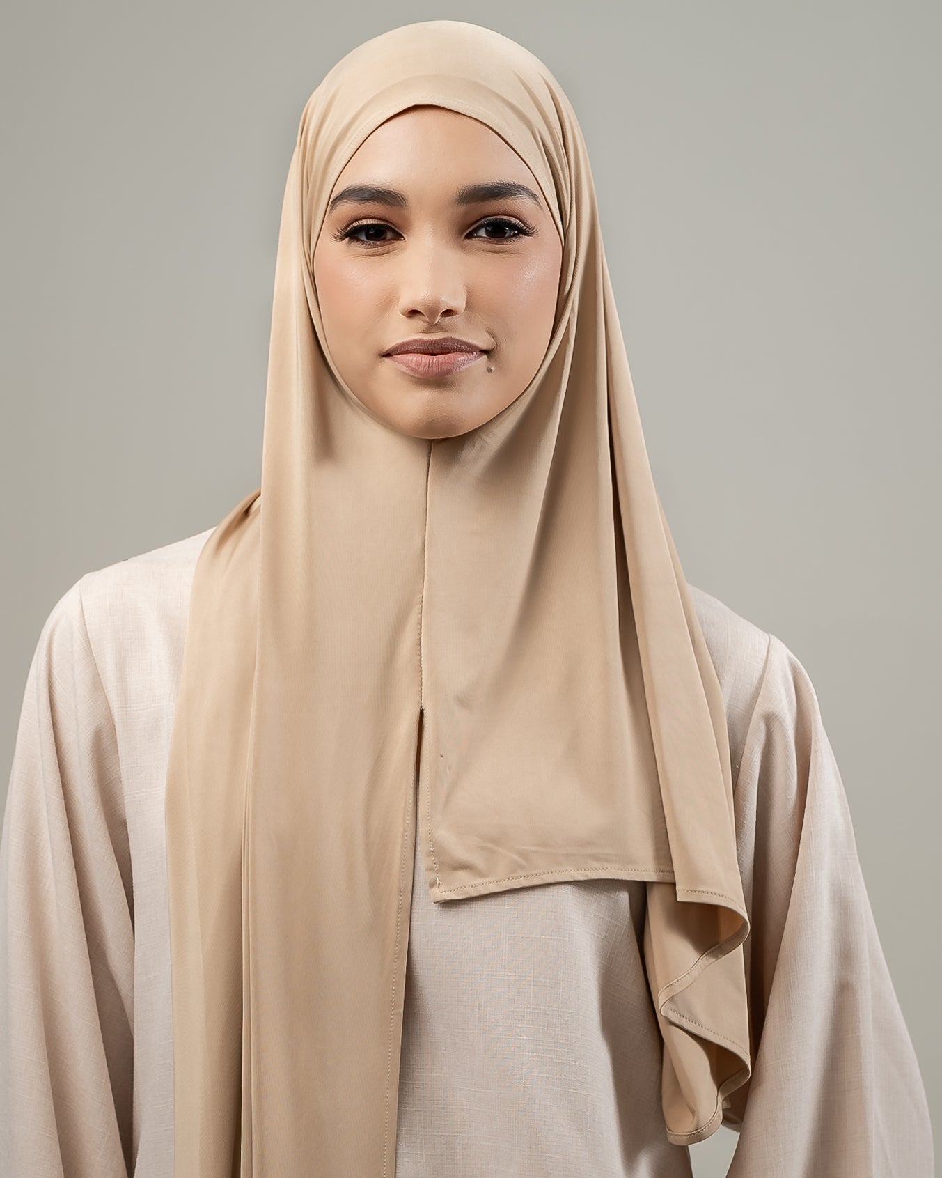 Crafted from a premium polyester-spandex blend, this hijab offers natural stretch for a snug, secure fit while remaining lightweight, breathable, and soft against the skin.