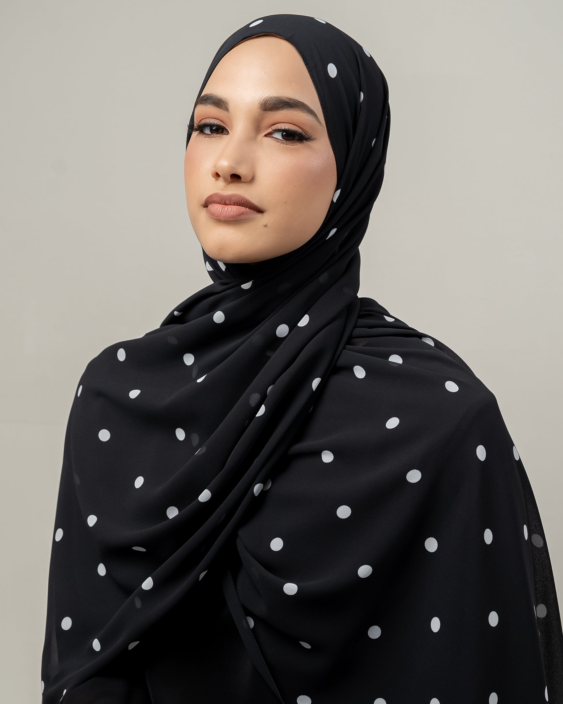 Introducing the Valenci Polka Dot Luxury Chiffon Hijab, a modern take on a timeless classic, designed for the woman who loves playful sophistication.