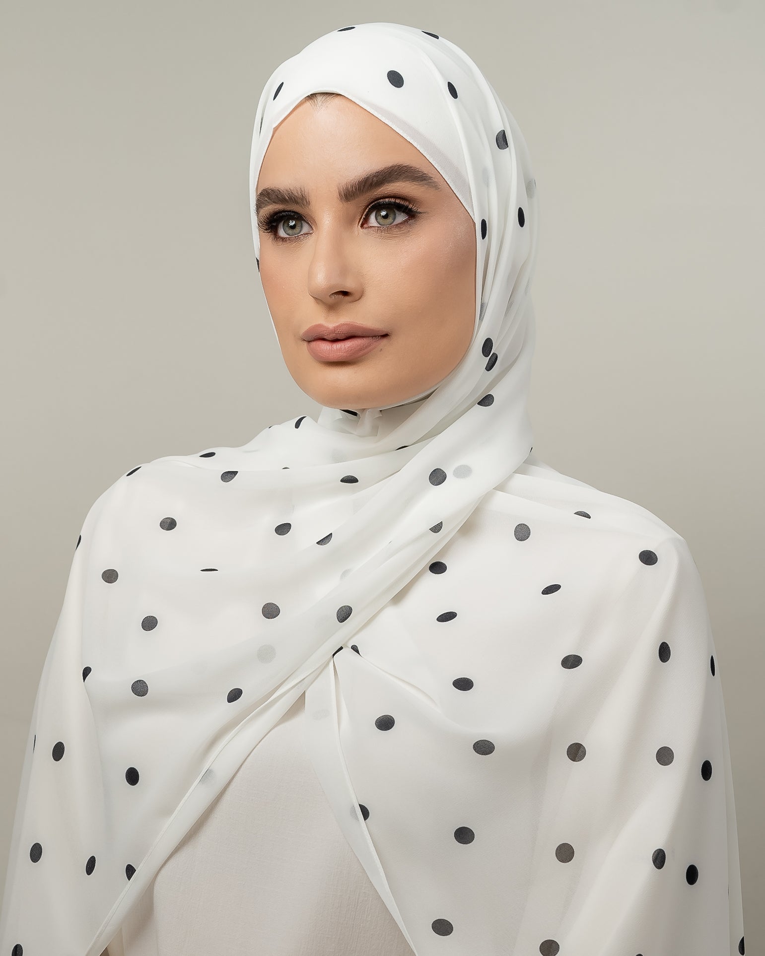 Introducing the Valenci Polka Dot Luxury Chiffon Hijab, a modern take on a timeless classic, designed for the woman who loves playful sophistication.